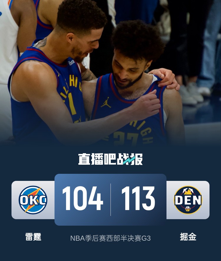5月10日讯 NBA季后赛西部半决赛G3,掘金回到主场迎战雷霆。目前双方1-1战平。