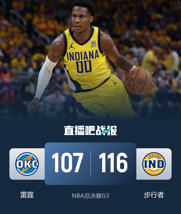 首节亚历山大虽然开场就遭遇重点盯防,但霍姆格伦和杰伦威站出来包揽球队前15分里的12分并率队取得15-6的领先;步行者开局虽然被动但很快找回状态不断蚕食分差;进入轮换阶段雷霆状态迅速下滑,轮换方面缺乏得分点导致他们在前16分钟里替补端一分未得,反倒是步行者的轮换表现更加出色,期间替补得分步行者19-0完胜对手;他们也正是抓住期间的机会在次节初完成比分反超;末段面对雷霆的反扑,哈利伯顿和西亚卡姆连续拿分为球队守住4分优势。休息归来雷霆虽然上来就是一波8-0但步行者短暂调整迅速回敬10-2夺回主动权;下半场雷霆几次取得领先但都没能守住,反倒是步行者在最后决胜时刻多点开花,内姆哈德中远投连续命中带队送出9-2的攻势拉开比分,最后时刻哈利伯顿上球助攻西亚卡姆打进关键球杀死比赛。步行者主场力克雷霆,大比分上2-1重新取得领先。