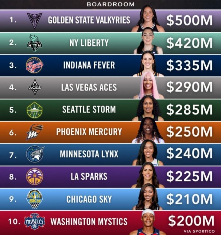 其中,本赛季刚加入联盟的金州女武神队高居估值榜首,达到5亿美元,远超多数WNBA传统球队。虽然是新军,但女武神表现惊艳——创下联盟商品销售纪录,预计今年通过赞助与门票收入将实现约5500万美元营收。