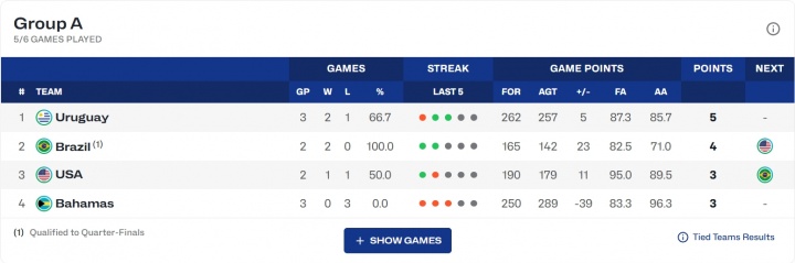 若美国男篮赢球,巴西男篮、乌拉圭男篮、美国男篮都是2胜1负,按照排名规则(三个小组前二以及两个成绩最好的小组前三进八强),三队都将晋级八强。