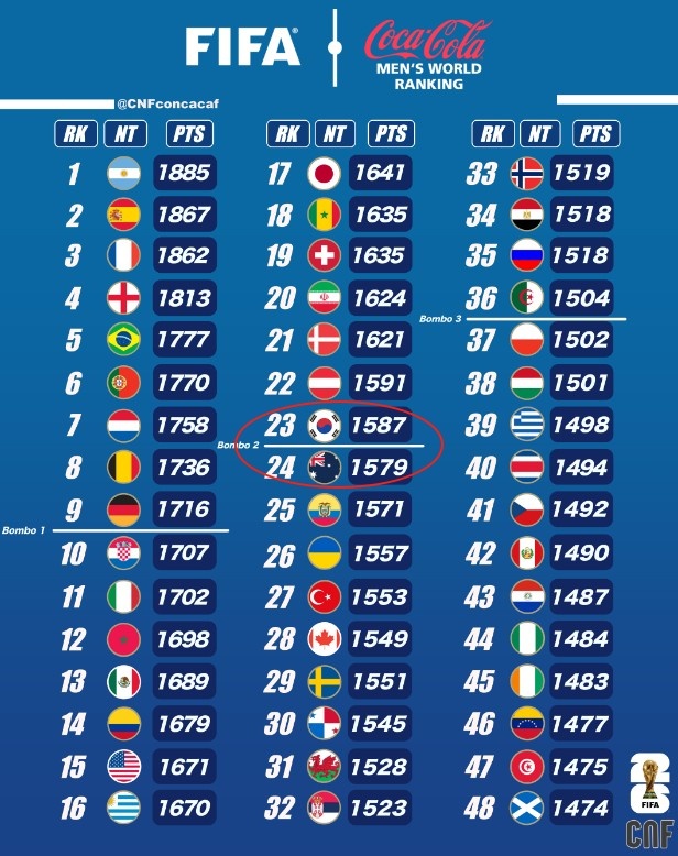 7月29日讯 除了美加墨作为东道主自动确定为2026世界杯一档球队之外,其他参赛球队将根据FIFA排名来确定分档,而在争夺世界杯二档球队方面,韩国和澳大利亚竞争激烈,因为双方排名和积分非常接近。
