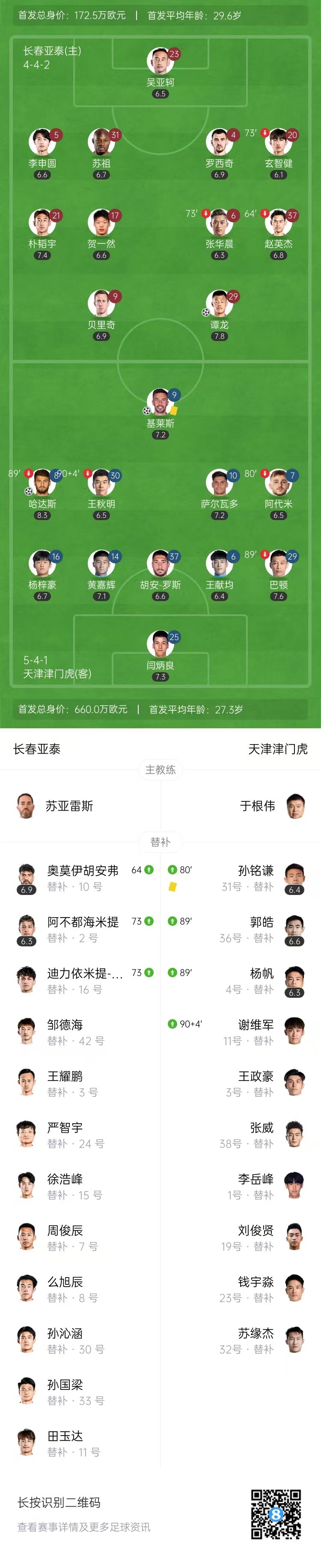 第66分钟,基莱斯接队友横传推射破门,边裁第一时间举旗示意越位,但经VAR回放后确认进球有效,天津津门虎2-长春亚泰。↓