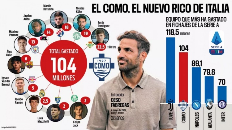8月6日讯 据西媒《阿斯报》发文表示,法布雷加斯执教的科莫今夏已经花费1.04亿欧签下10名新球员,转会支出仅次于尤文,位列意甲第二多。在印尼富豪的支持下,科莫正在成为意甲的一支重要力量。